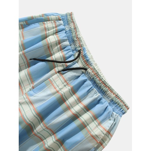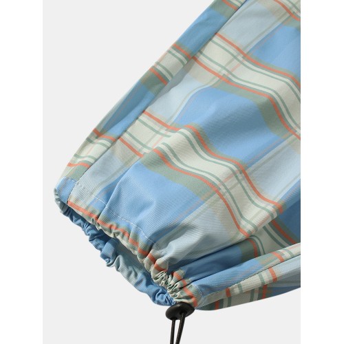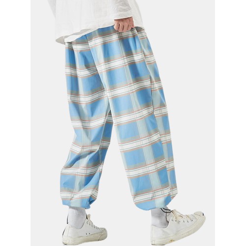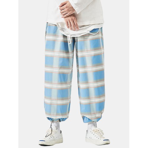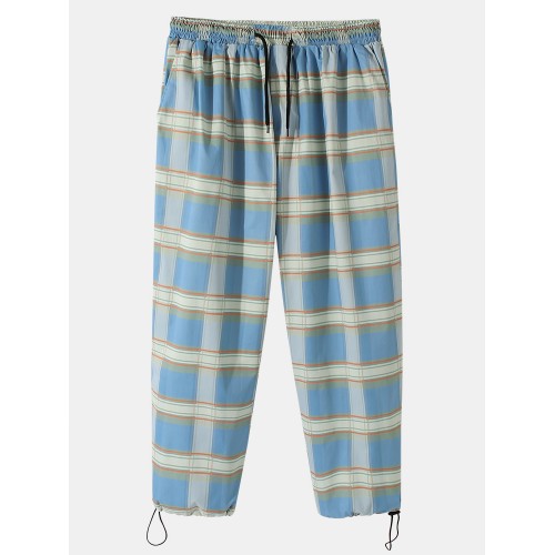 Mens Plaid Relaxed Fit Drawstring Cuff Pants With Pocket