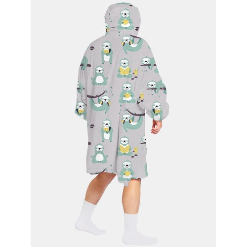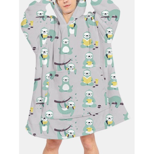 Mens Cartoon Animal Print Reversible Oversized Blanket Hoodie Home Sleepwear Robes With Pocket