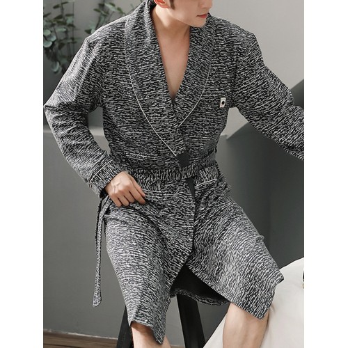 Mens Solid Color Letter Embroidery Double Pocket Lapel Sleepwear Robes With Sashes